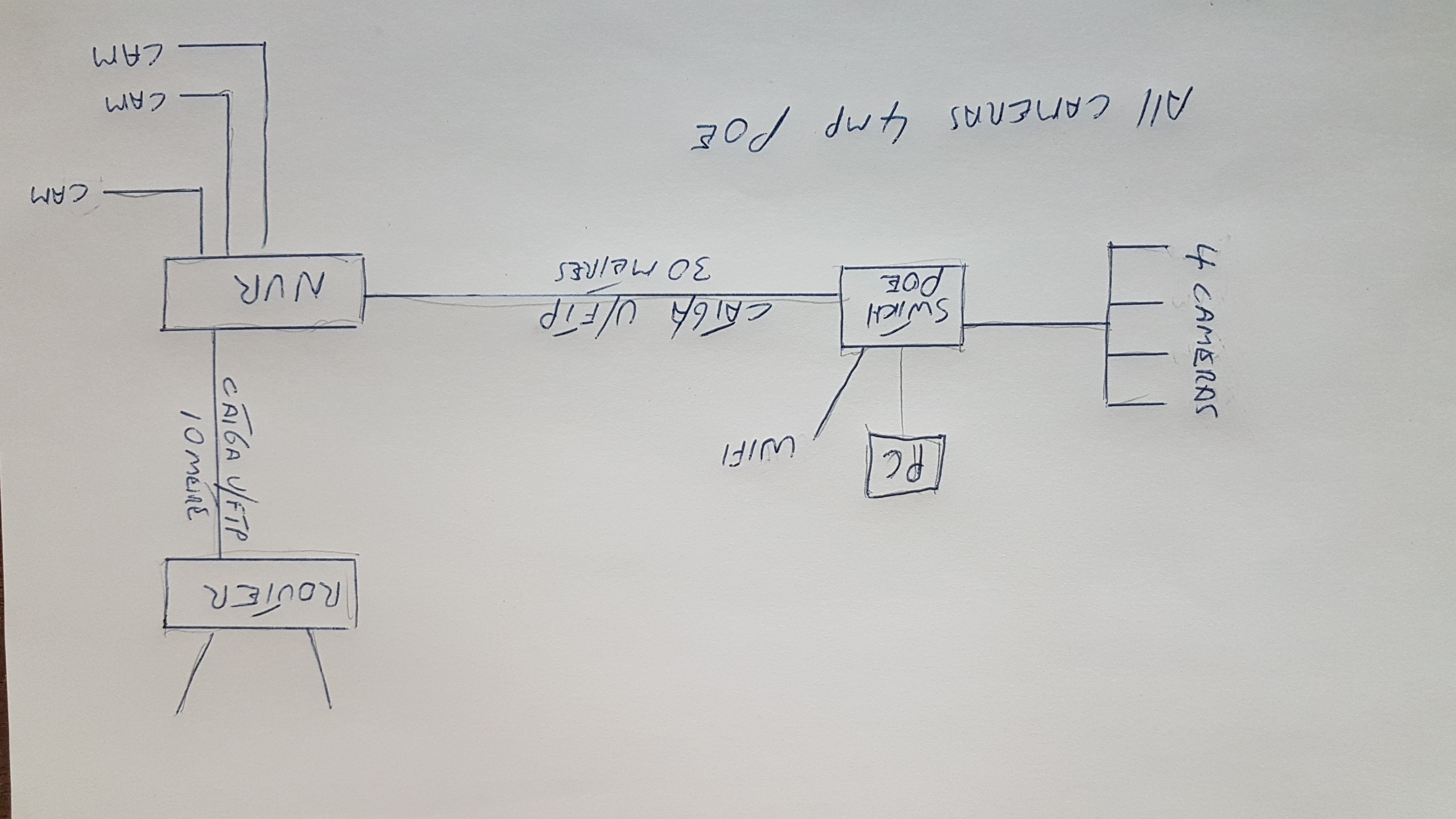 I hope the attached sketch gets the point across. I am planning a network for CCTV and have decided on hard-wired as wireless looks like a nightmare to manage. My router is located in a separate room from the planned location of the PVR/UPS, at about 10 metres distance. My workshop is located at 30metres distance.