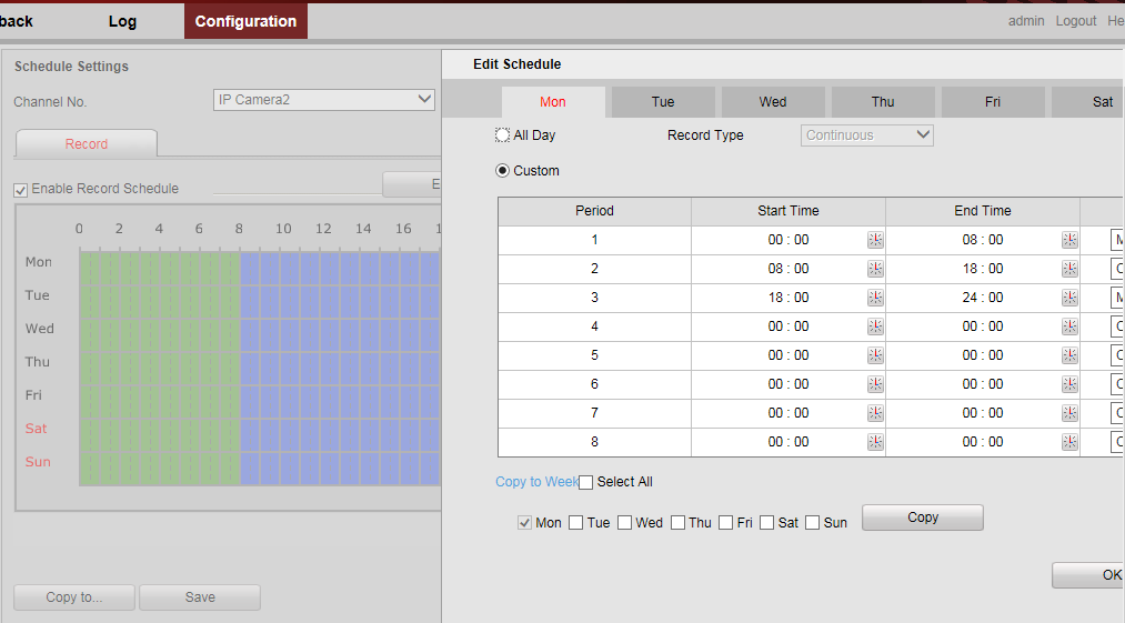 I thought this would be relatively easy to set up. I went into the NVR and went onto the "schedule settings" tab, ticked "enable record schedule", clicked edit, clicked custom and setup my schedule for "motion detection" between 00:00 and 08:00, continuous between 08:00 and 18:00 and motion detection again between 18:00 and 00:00. However when I look in my playback view there is just a gap from 18:00-08:00 and no motion events?